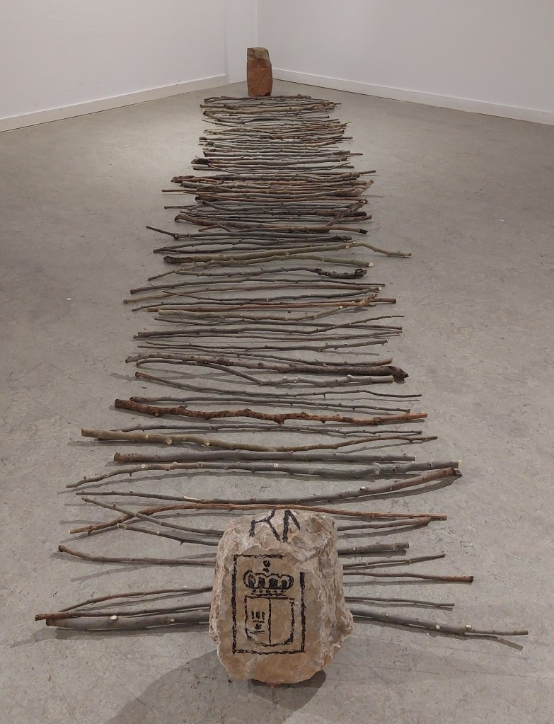 Los palos evocan la vara de medida histórica que fijaba el ancho de la cañada (90 varas castellanas, equivalentes a unos 75 metros), y al mismo tiempo funcionan como metáfora de la fragilidad y la persistencia: ramas recogidas del entorno que se convierten en trazos de memoria sobre el suelo.