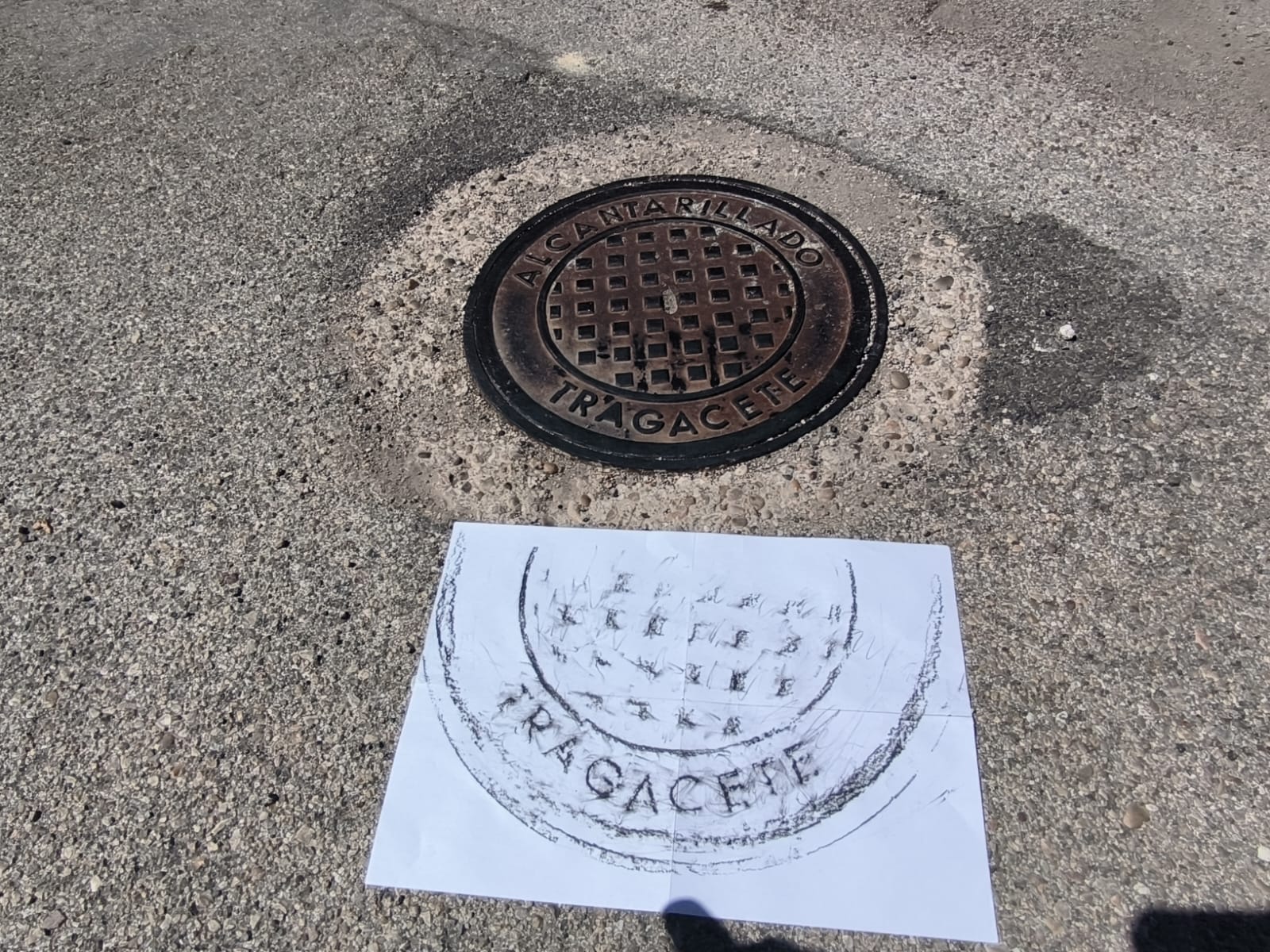 Huellas gráficas obtenidas mediante frottage de alcantarillas en Tragacete y Viso del Marqués. Las impresiones se presentan en papel y fotografía como trazos de memoria compartida en la cañada.