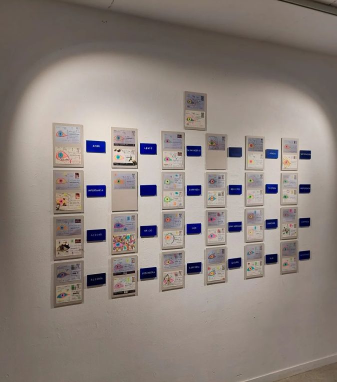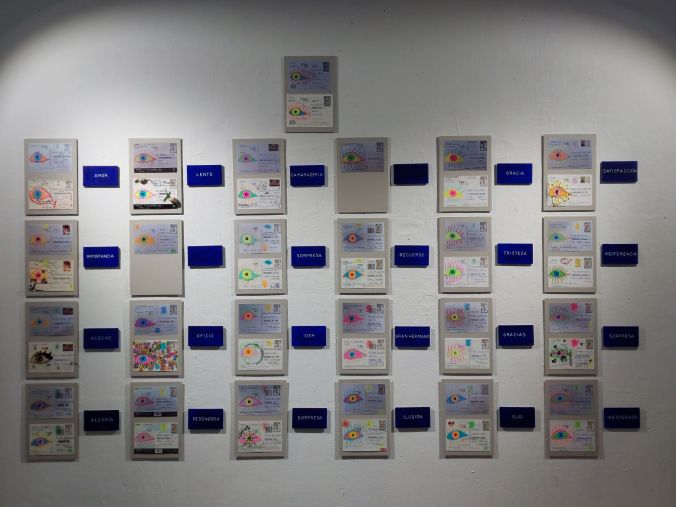 Además de la postal, cada persona debía enviarme una palabra que definiera la sensación que le producía recibirla. Yo convertía esa palabra en un pequeño cuadro: azul de Prusia con la palabra escrita en blanco, en diálogo directo con la economía formal y la insistencia temporal de Kawara. El proyecto activa un mapa emocional y participativo, donde el tránsito, la espera, la respuesta y el gesto cotidiano se convierten en materia artística.