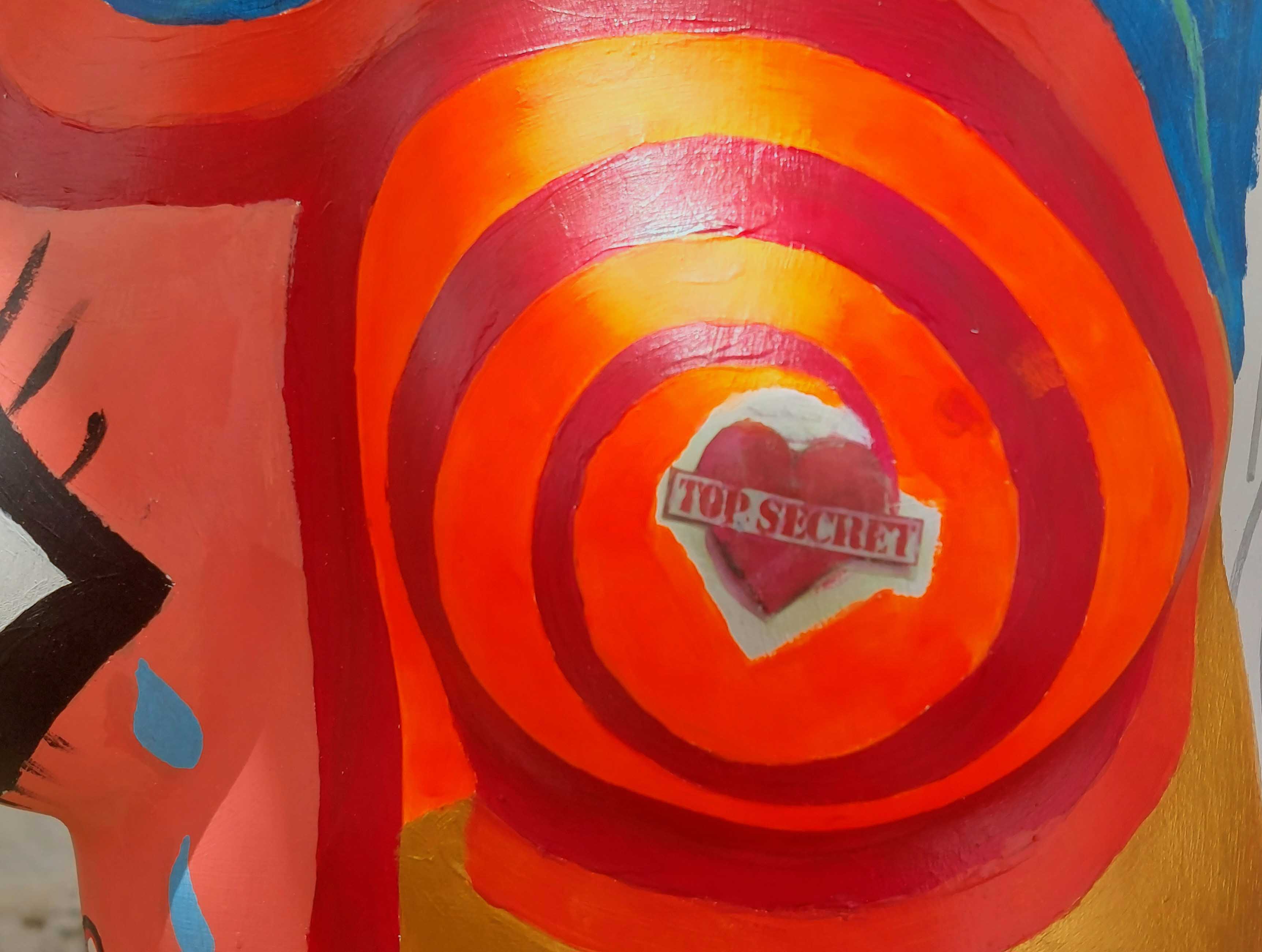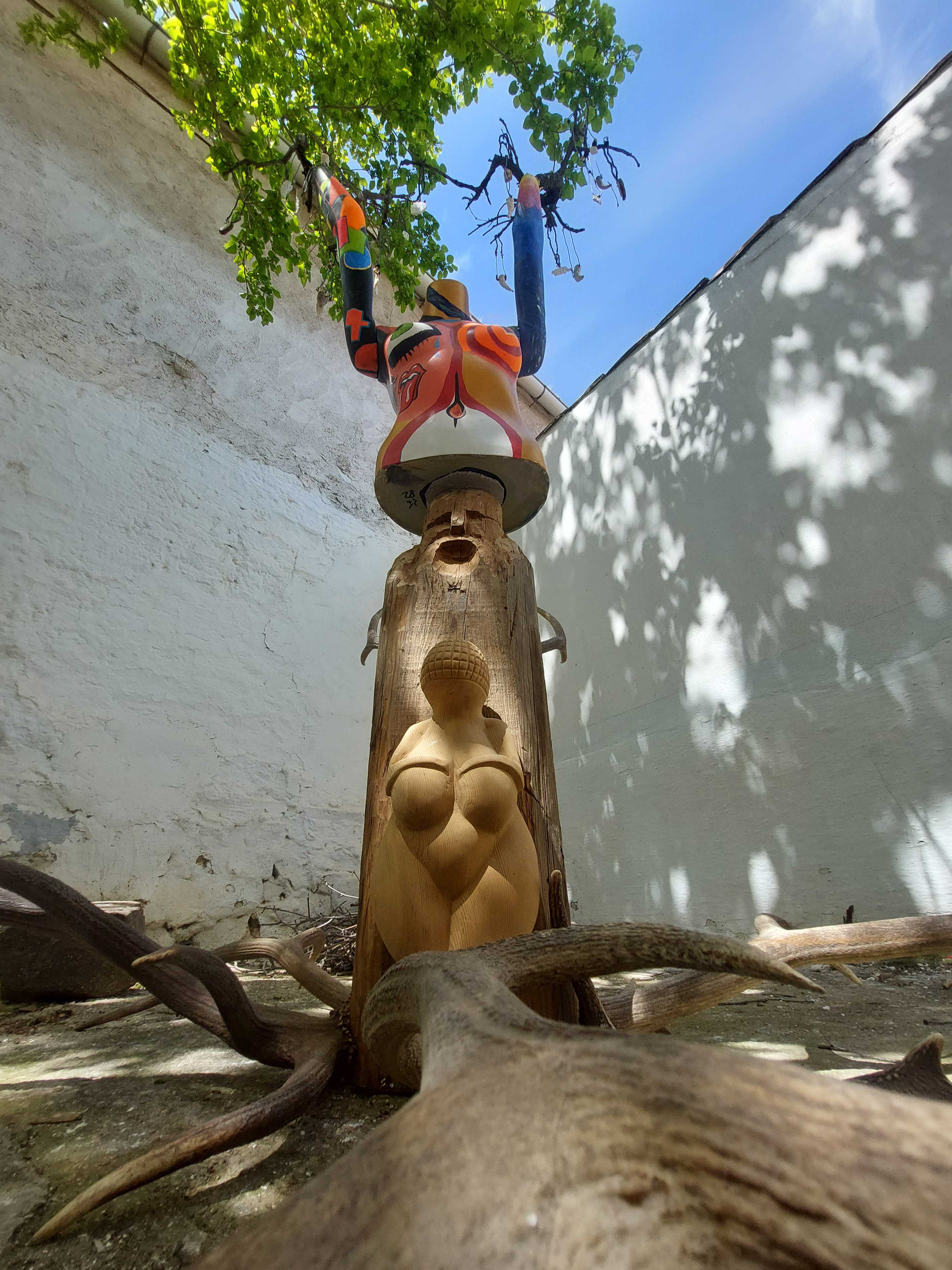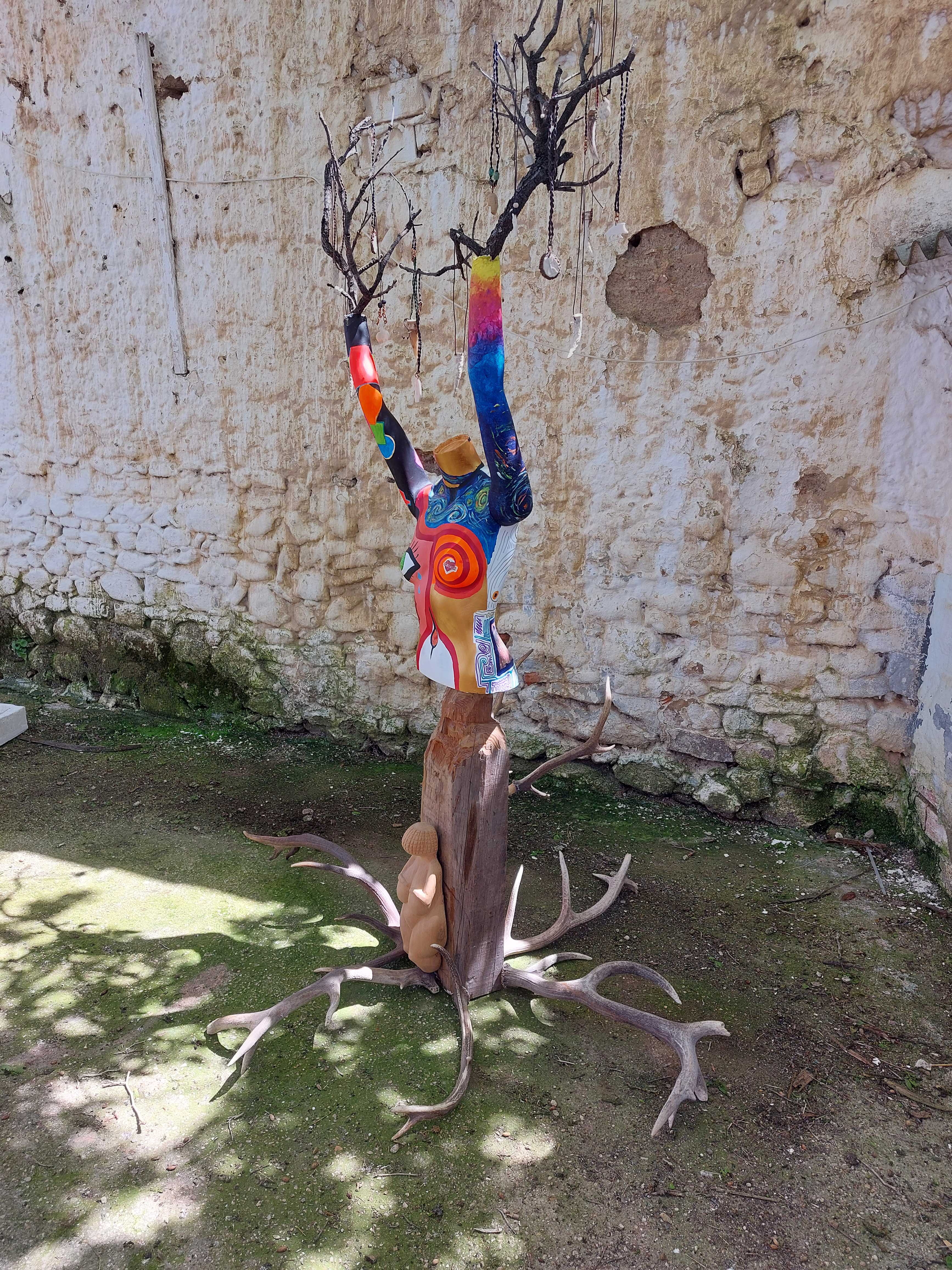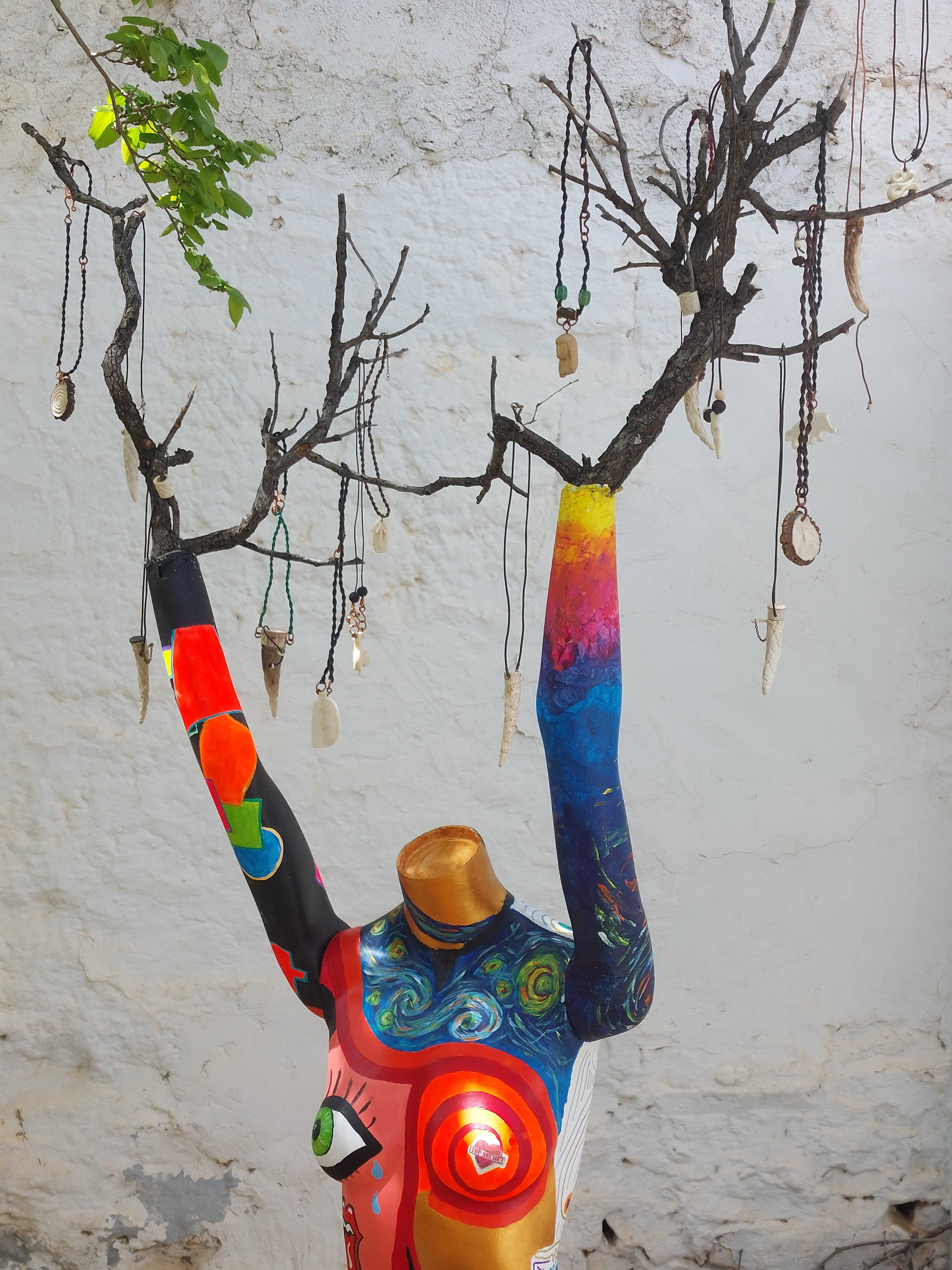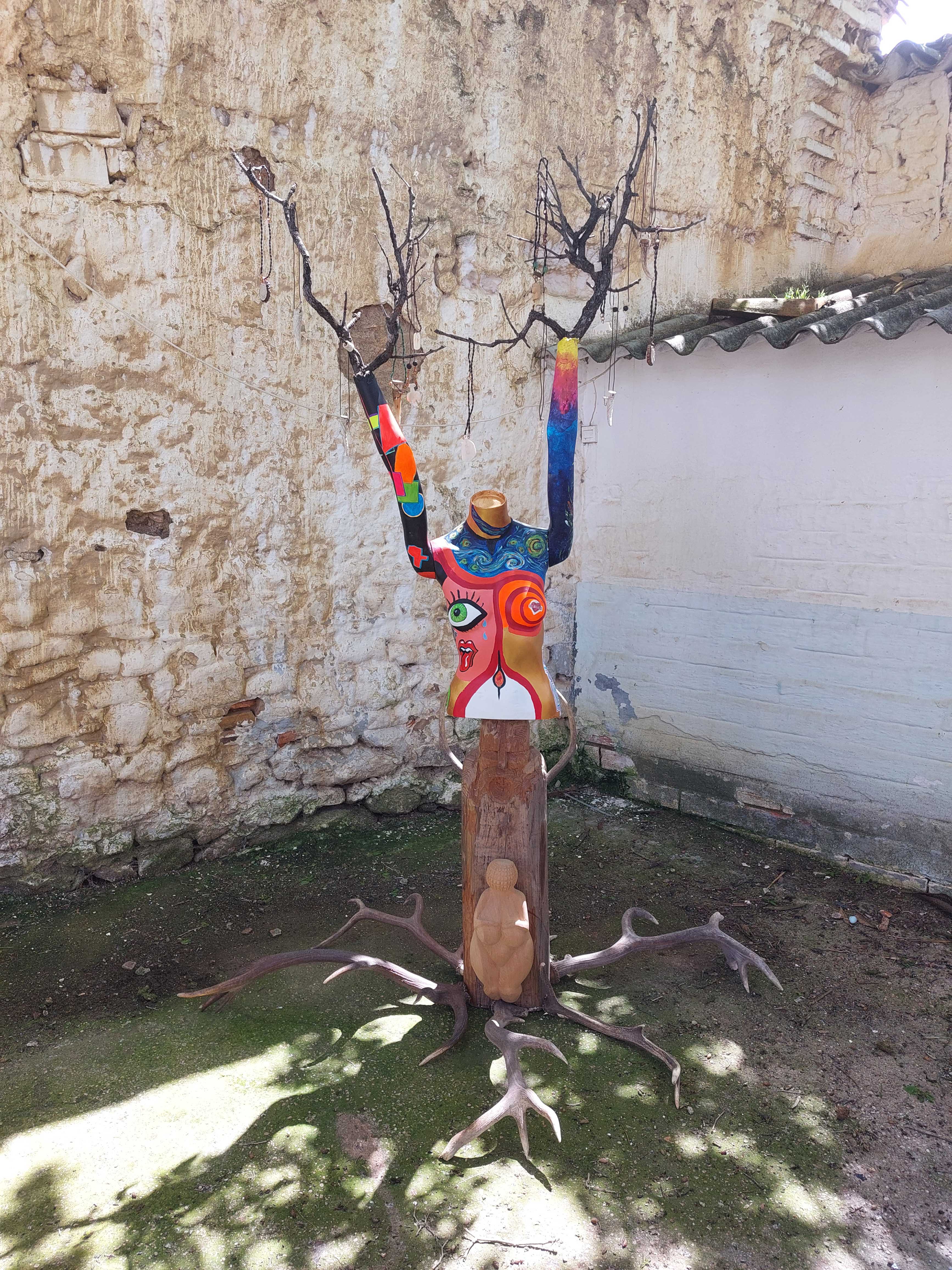 En la base, una viga de roble reciclada sostiene la talla de una Venus de Willendorf —figura arquetípica de fertilidad— realizada años atrás junto a la artesana Mar Cambronero durante los mercados medievales. Sobre ella se alza un torso de maniquí pintado con acrílicos en un lenguaje expresionista que combina geometrías, espirales, ojos y colores vibrantes.