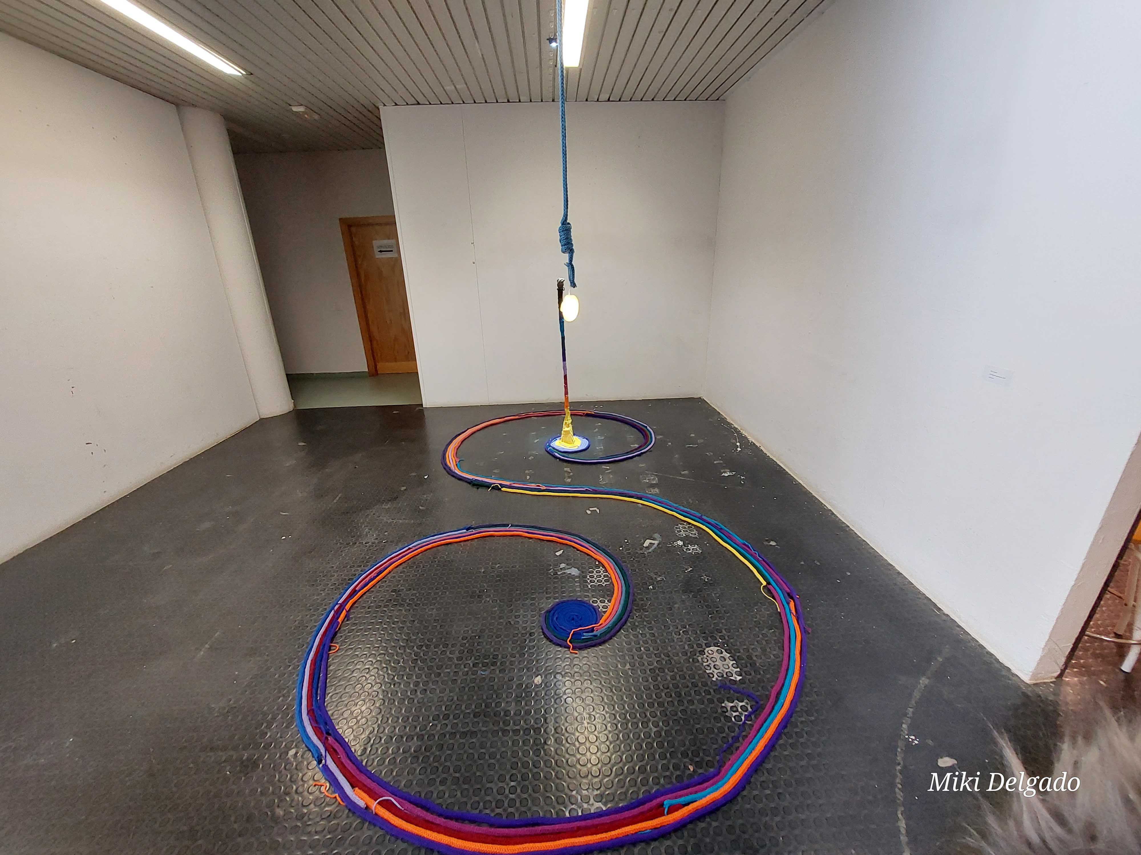 Segunda pieza de la serie Mi pequeña guerrera (I, II y III). Esta instalación textil celebra la vida y la energía vital de mi perra, representada a través de una doble espiral celta tejida en lana de colores. La espiral simboliza el flujo de la existencia: un recorrido continuo entre la tierra y el espíritu.
