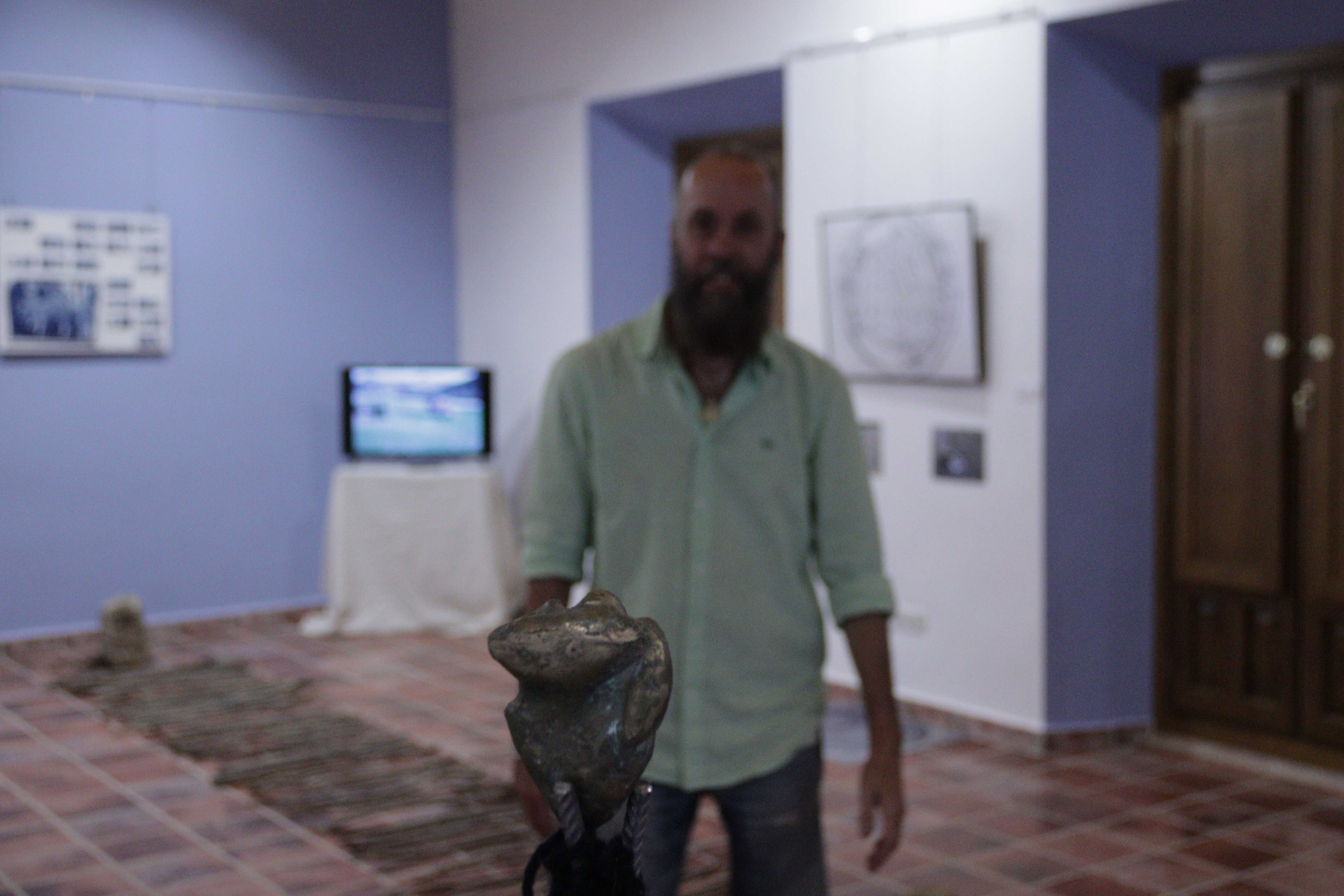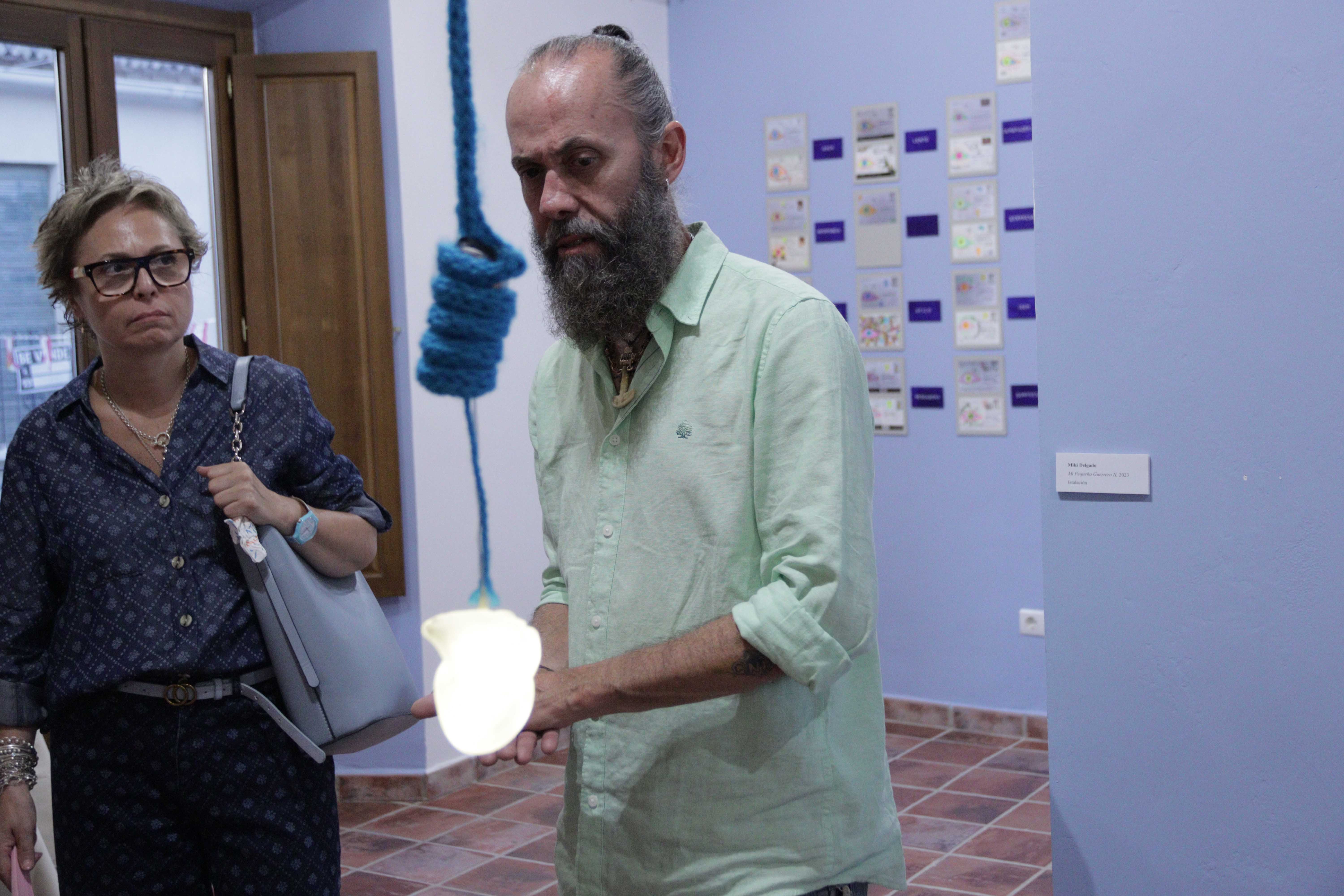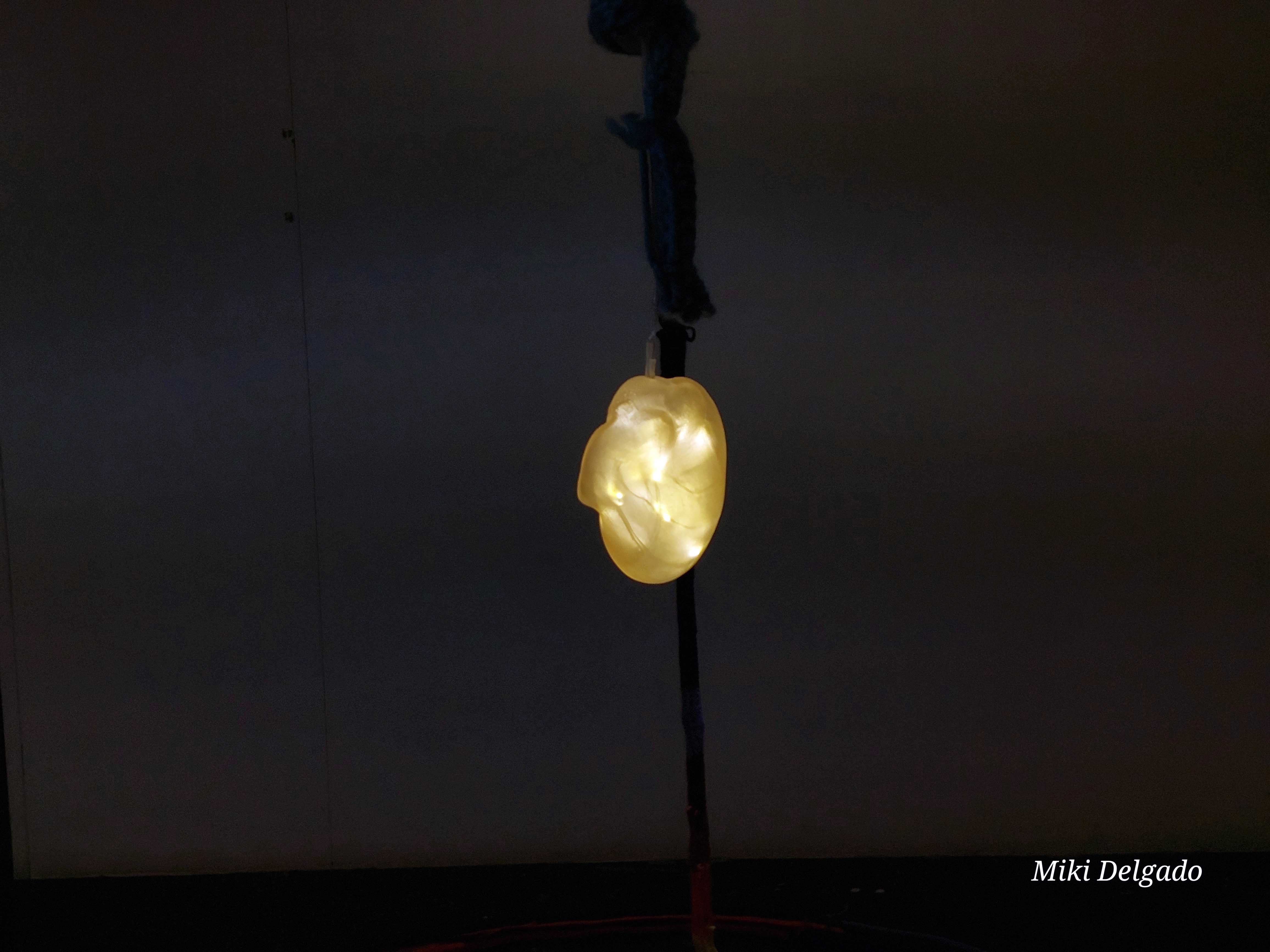 - Materiales: lana teñida, corazón de bronce, resina translúcida, luz LED, pedestal recubierto de lana
